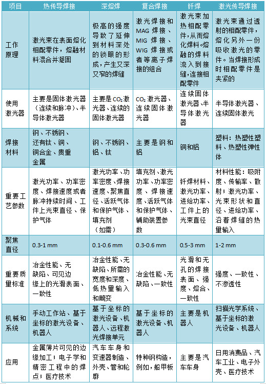 根据工作原理的不同,适配不同的加工场景,激光焊接可分为热传导焊、深熔焊、复合焊接、激光钎焊和激光传导焊接五种,具体如下:
