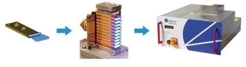 第一种方法是采用激光巴条(Laser Bars)技术,即在氮化铟镓(InGaN)材料的晶片上系统地生成激光单芯片(Single Emitter),先将多个单独的激光芯片高效地集成到一个所谓的激光巴条,每个激光巴条可产生至少50W的蓝光。然后通过适当的电连接、冷却散热,以及使用特殊的光学器件,将多个半导体激光巴条安装组合成一个半导体激光堆栈(Stack)。整个半导体激光器可以用一个或数个半导体激光堆栈组合而成,如图4所示。目前,激光巴条技术可以达到2kW的蓝光功率[4]。