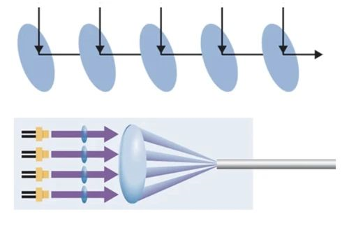 由于蓝色单个激光半导体芯片仅具有几瓦的输出功率,而其将功率提高到更高的功率范围是非常耗时且昂贵的。为了开拓蓝光激光的巨大应用潜力而所需的高功率,将需要新的技术方法。迄今为止,蓝光半导体激光的每个芯片的实际功率在单个波长下约5W[2],因此合束多个芯片输出的光束组合技术对于获得更高的功率输出是必不可少的。光束组合的方法分为相干方法和非相干方法。其中,非相干方法比较实用,无需在激光器之间进行精细的相位控制。非相干方法包括在空间上组合多个光束的空间组合方法,在偏振分束器中组合正交偏振光的偏振组合方法,以及在同轴上组合不同波长的波长组合方法。每种方法都有其优点和缺点,并且还可以组合使用每种方法。其中,空间组合适合于组合多个相同波长的激光芯片以获得高功率输出[3]。迄今为止,两种高功率合成方法最为成功,以下作个简单介绍。
