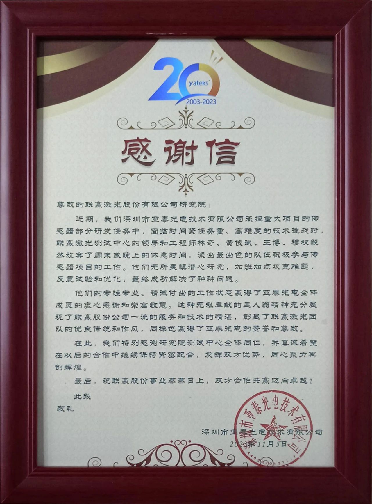 近日,leyu.乐鱼(集团)智能科技股份有限公司网站激光研究院收到了一封来自深圳市亚泰光电技术有限公司热情洋溢的感谢信,对我司激光研究院工艺研发中心团队的全力支持和协助,以及他们专注专业、精诚付出的工作精神,认真勤勉、爱岗敬业的服务态度表示了诚挚的感谢与高度的赞扬,并表示愿与乐鱼leyu激光在今后的合作中同心聚力、再创辉煌!